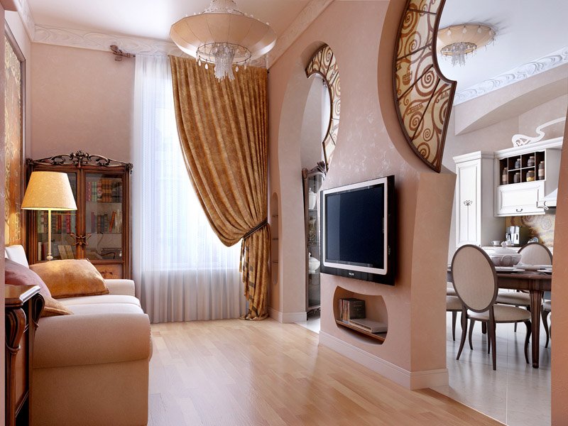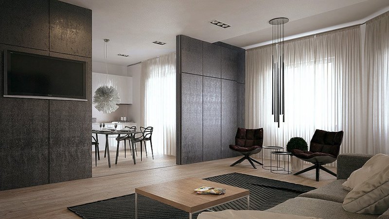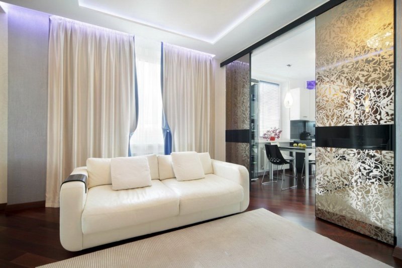 Для небольших пространств подойдут тканевые перегородки. Их роль могут выполнить обычные шторы. Лучшим выбором будут легкие полупрозрачные ткани светлых тонов. Шелк и атлас добавят помещению роскоши, шика. Тюль, шифон создадут воздушность, раздвинут пространство. Наиболее уместны перегородки из текстиля в квартире-студии, где кухня, столовая, гостиная не имеют четких границ.