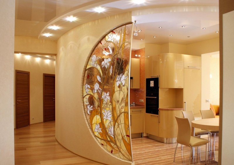 Стеклянные перегородки поражают многообразием. Они бывают матовыми, прозрачными, с нанесенными на них узорами, с помощью фотопечати их украшают разнообразными снимками. Стекло поможет отделить комнаты, сохраняя при этом уровень освещенности, зрительно увеличит пространство. В просторных помещениях викторианского стиля, арт-деко или готике гармоничны цветные витражи.