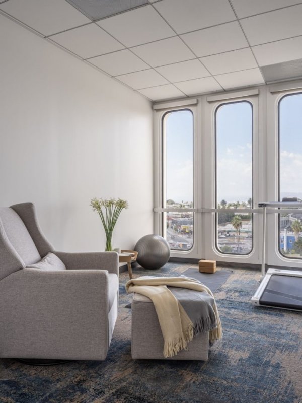 Все офисные помещения имеют стеклянные перегородки, пропускающие дневной свет и позволяющие наслаждаться видом на внутреннее пространство. Дизайнеры создали и место для уединения, где можно отдохнуть и сосредоточиться. Здесь есть комната для кормящих матерей или для тех, кто просто хочет помедитировать или походить по беговой дорожке.