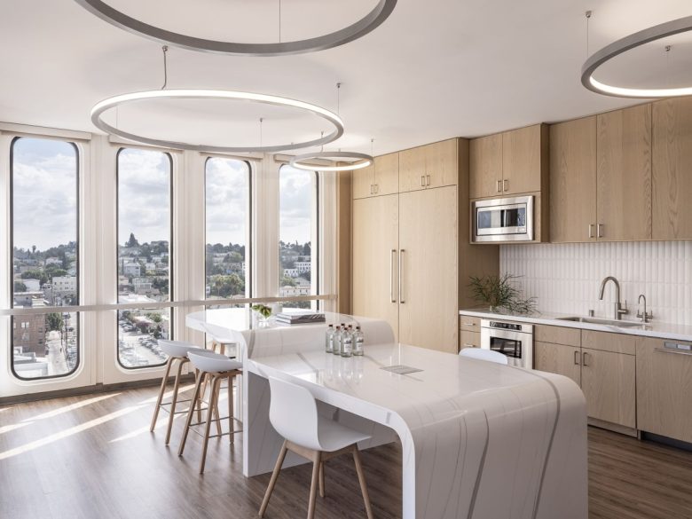 Несмотря на то что офис расположен на шестом этаже, здесь сохраняется связь с окружающим миром. Вместо того чтобы использовать пространство для еще одного кабинета руководителя, оно было преобразовано в просторную общую кухню. При входе в нее открывается вид на бульвар Сансет, озаренный светом. Изготовленный на заказ скульптурный кухонный остров из камня достаточно большой, чтобы служить местом для мозгового штурма или для совместных обедов.