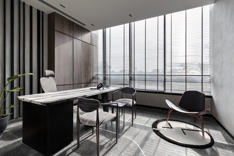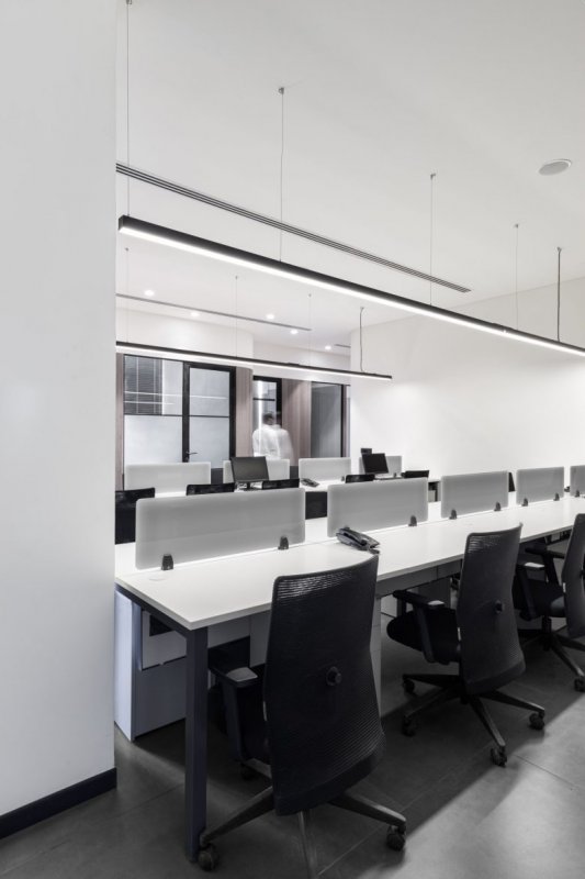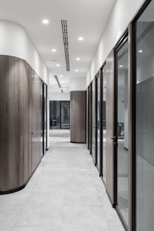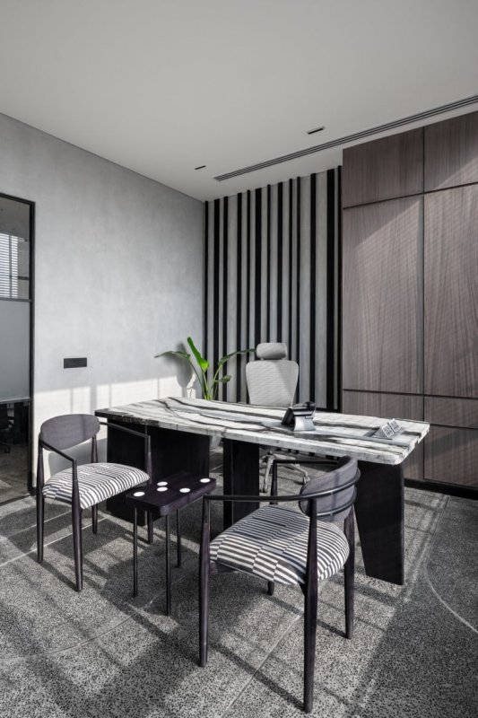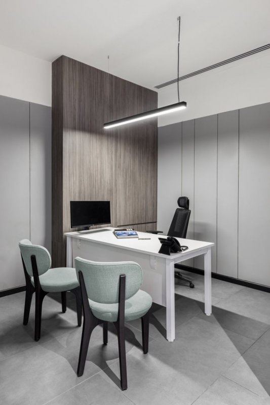 Этот офис гармонично объединяет в себе функциональность и эстетическую привлекательность, создавая атмосферу, способствующую продуктивности и креативности. Использование серой палитры и минималистичного дизайна подчеркивает современный подход и элегантность, делая офис идеальным местом для воплощения амбициозных идей и проектов.