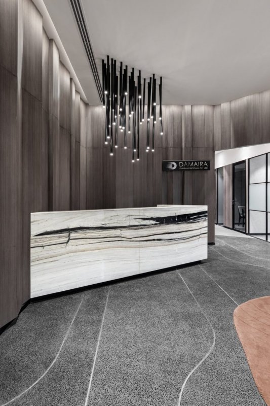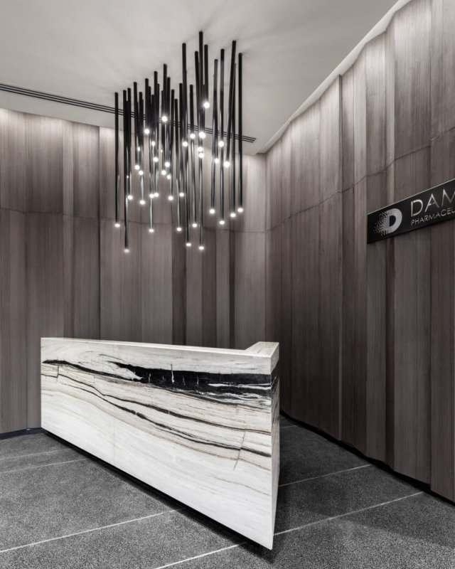 Проект представляет собой офисное пространство площадью 340 квадратных метров, созданное для фармацевтической компании.