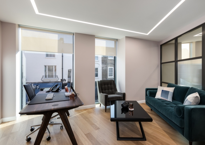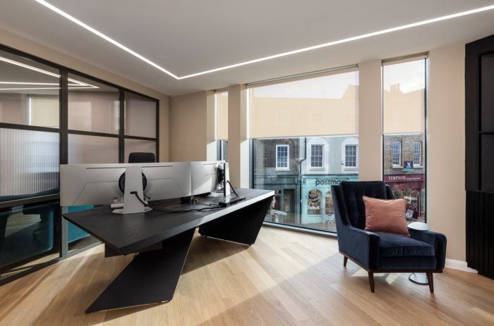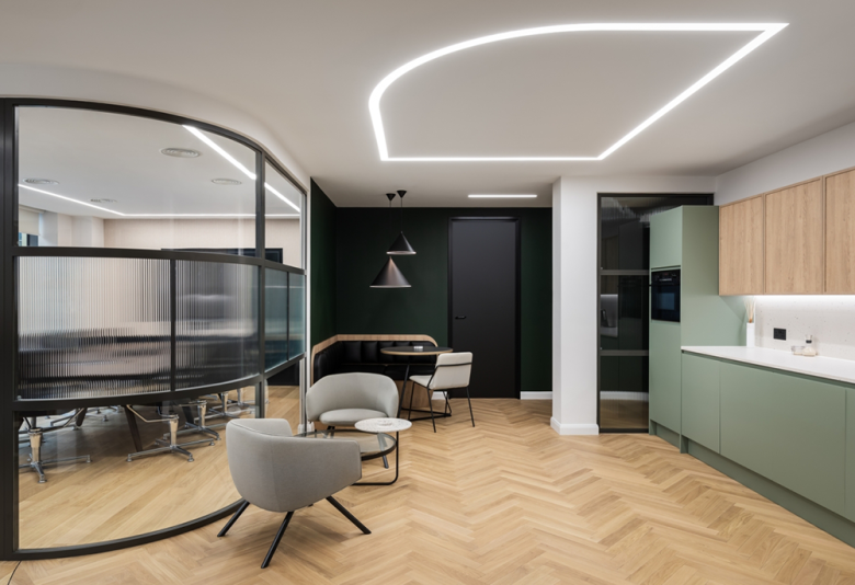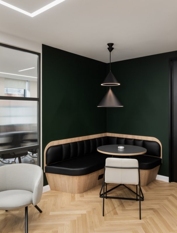 Здание с уникальной угловатой структурой потребовало особого архитектурного подхода. Oktra планировала использовать угловые формы мебели, чтобы сбалансировать острые углы. Для сохранения естественного света были установлены стеклянные перегородки с рифлеными деталями для дополнительной конфиденциальности. Они помогают сохранить легкость и воздушность в помещении.