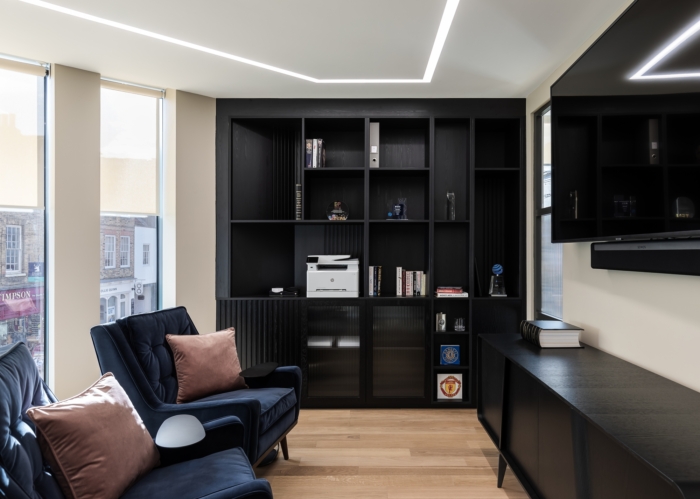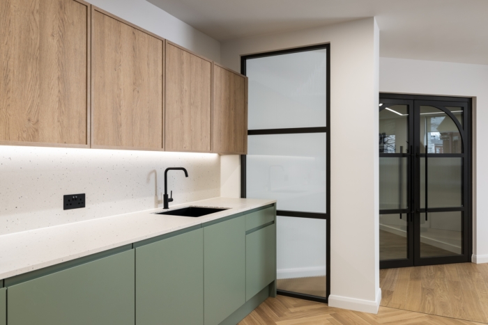 Чтобы подчеркнуть высочайшее качество в компании, были внедрены различные индивидуальные детали. Использование рифленого стекла, текстурированной отделки фартука, кожаных дверных ручек и необычных дизайнерских решений создает минималистичное, но роскошное ощущение. Функциональность оставалась в приоритете благодаря индивидуальным системам хранения, изготовленным по точным спецификациям Bear Capital.