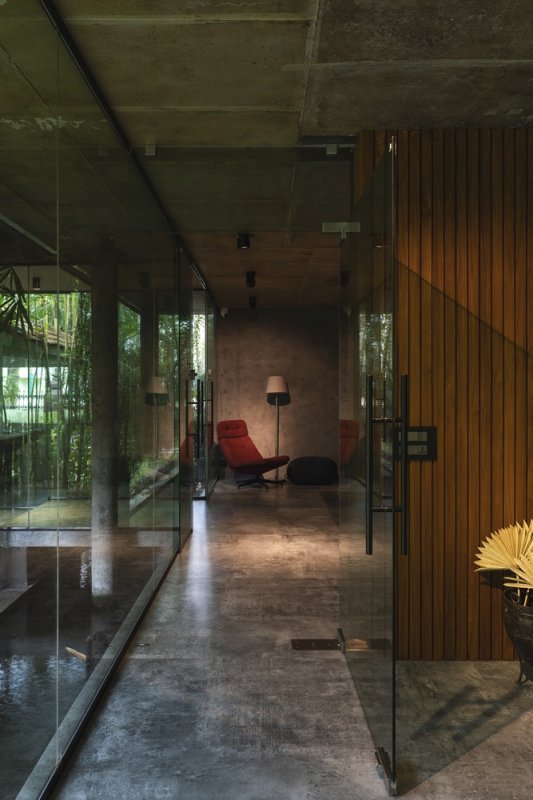 Контекст участка и требования клиента сыграли ключевую роль в разработке уникального дизайна. Поскольку новый офис является расширением, важно было обеспечить визуальную и пространственную непрерывность. Для того чтобы обеспечить видимость из резиденции клиента, расположенной к югу от участка, офис был соответствующим образом ориентирован. В связи с тем, что помещение находится в тропическом влажном климате, необходимо было создать собственный микроклимат, в офисе чтобы обеспечить комфортную рабочую атмосферу.