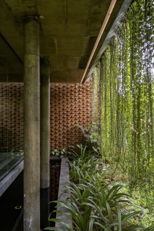 Требованием к дизайну офиса был минималистичный и современный стиль с пространствами, имеющими стеклянные стены и красивый ландшафт. Клиент особенно настаивал на включении прудов с рыбами кои в ландшафт. Это стало приоритетом. Вместо того чтобы создать пруд отдельно, было решено интегрировать водоем в общий дизайн. Дизайнеры воплотили в жизнь концепцию плавучего офиса, спроектировав его над водоемом. Читайте также - Строительно-отделочные и монтажные работы. Наша бригада выполнит полный комплекс услуг для реализации дизайн-проекта в соответствии с ГОСТ - услуги проектирования домов по доступным ценам. Сохранив архитектуру старого офиса, его объединили с новым зданием. Дизайн должен был включать обилие зелени во внутренних помещениях. Тропическая архитектура в единстве с красивой природой помогла создать уникальное офисное пространство. Контекст участка и требования клиента сыграли ключевую роль в разработке уникального дизайна. Поскольку новый офис является расширением, важно было обеспечить визуальную и пространственную непрерывность. Для того чтобы обеспечить видимость из резиденции клиента, расположенной к югу от участка, офис был соответствующим образом ориентирован. В связи с тем, что помещение находится в тропическом влажном климате, необходимо было создать собственный микроклимат, в офисе чтобы обеспечить комфортную рабочую атмосферу. Еще одной проблемой были пыль и шум от столярной мастерской, расположенной на востоке предполагаемого участка. Для защиты от этих факторов была построена пятиметровая стена из кирпича с проволочной нарезкой, которая снизила уровень шума и пылевого загрязнения. Пруд с рыбами и помог создать необходимый микроклимат. Вьющиеся растения, образующие зеленую завесу, создают линейный сад на крыше, способствуя поддержанию теплового комфорта. Рабочее пространство и конференц-зал практически полностью прозрачны. Через стеклянные стеныы можно любоваться окружающей природой. Вьющиеся растения блокируют солнечный свет, а пруд помогает контролировать влажность. Все вместе это создает комфортную зону даже в жаркий солнечный день. Верхние балки делают пространство более просторным, а открытая отделка и гладкие элементы дизайна усиливают этот эффект. Значимость проекта заключается в стремлении объединить природу и застройку. Плавающая конструкция опирается на колонны, погруженные в водоем, что придает легкость строению и поднимает его над землей. Дизайн гармонично вписывается в ландшафт и приносит пользу как пользователям, так и посетителям. Здесь поощряются встречи на открытом воздухе, где расположен «Туласи Тара» — классический элемент архитектуры Кералы, переосмысленный в упрощенной форме. Офис полностью питается от солнечной энергии, что делает его зданием с нулевым потреблением энергии. Вода из пруда с карпами кои, обогащенная питательными веществами, используется для орошения окружающих растений. Пористое наружное покрытие позволяет воде просачиваться в землю во время дождей, минимизируя сток и сохраняя уровень грунтовых вод. Офис спроектирован в регионе, где не осознают важности сохранения природы и экологии. Архитектура офиса демонстрирует энергоэффективные решения и позитивные изменения, учитывающие интересы местных жителей. В непосредственной близости 