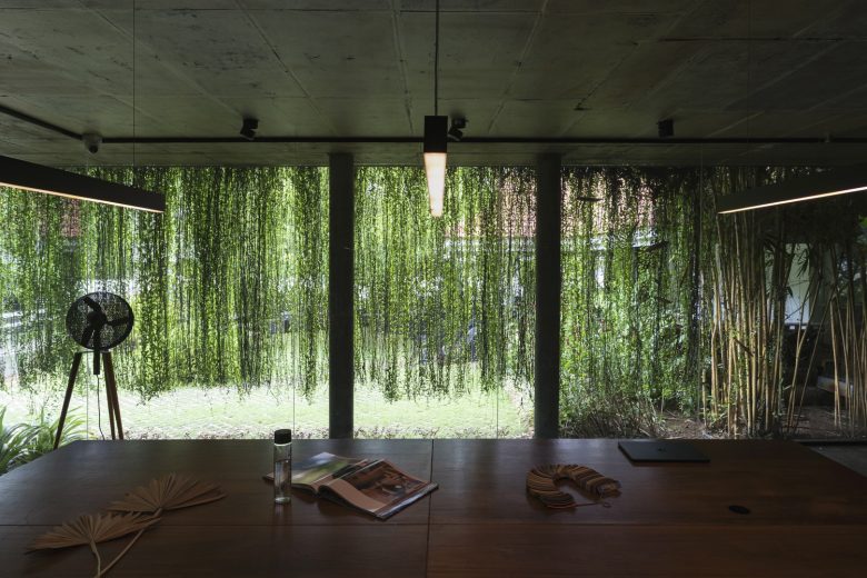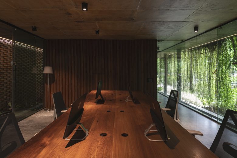 Рабочее пространство и конференц-зал практически полностью прозрачны. Через стеклянные стеныы можно любоваться окружающей природой. Вьющиеся растения блокируют солнечный свет, а пруд помогает контролировать влажность. Все вместе это создает комфортную зону даже в жаркий солнечный день. Верхние балки делают пространство более просторным, а открытая отделка и гладкие элементы дизайна усиливают этот эффект.