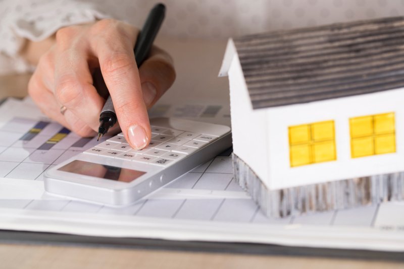 Young woman makes some calculations. Small paper house, coins, car in the background. Closeup
