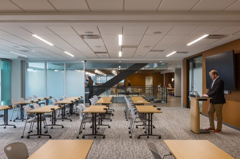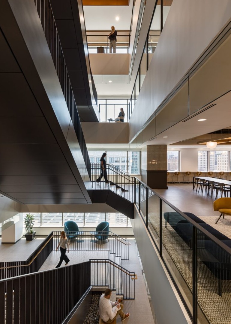 Центральным элементом планировки стала лестница, соединяющая несколько этажей и выполняющая роль не только функционального, но и социального ядра. Она стимулирует движение внутри здания, способствует спонтанным встречам и обмену идеями. Вокруг неё расположены различные зоны удобств, при этом каждый этаж имеет своё уникальное пространство — будь то библиотека, зона отдыха или кафе, что поощряет сотрудников перемещаться и использовать офис более активно.