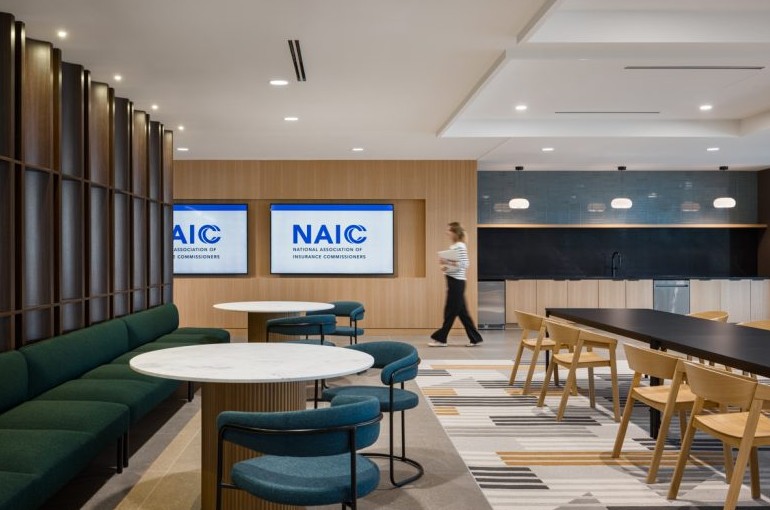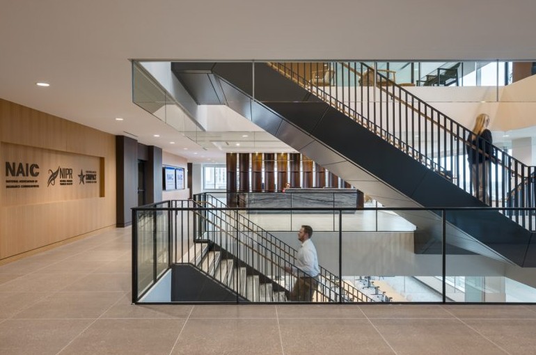 Национальная ассоциация страховых комиссаров (NAIC) — одна из старейших профессиональных организаций США, основанная в 1871 году для поддержки страховых регуляторов штатов и защиты интересов страхователей. Зона отдыха офиса NAIC с зелёными акцентами Сегодня она объединяет более 600 сотрудников, и для такой масштабной структуры рабочая среда играет ключевую роль. Совместно с Helix Architecture Design организация реализовала новый офисный проект, ориентированный на будущее и на людей, которые в нём работают. Центральная лестница офиса NAIC в атриуме В основе концепции лежит глубокий аналитический подход. Архитекторы совместно с командой заказчика изучили потребности различных подразделений, особенности рабочих процессов и корпоративную культуру. Учебный зал офиса NAIC с рабочими столами Это позволило создать пространство, которое отражает ценности организации, усиливает её идентичность и способствует более тесному взаимодействию между сотрудниками. Одним из ключевых решений стал переход от традиционной системы закреплённых рабочих мест к гибкому формату free-address, что позволило оптимизировать площадь и освободить место для общественных и рекреационных зон. Переговорная офиса NAIC со стеклянными перегородками Рабочие зоны организованы по принципу «соседств», где сотрудники могут выбирать наиболее подходящее место в зависимости от задач. В офисе предусмотрены пространства для командной работы, зоны для неформального общения, а также тихие участки для сосредоточенной индивидуальной деятельности. Общая зона офиса NAIC с мягкой мебелью Приватные кабинеты не закреплены за конкретными людьми и доступны всем, кому требуется уединение, что делает офисную среду гибкой и адаптивной. Многоуровневый атриум офиса NAIC с лестницами Центральным элементом планировки стала лестница, соединяющая несколько этажей и выполняющая роль не только функционального, но и социального ядра. Она стимулирует движение внутри здания, способствует спонтанным встречам и обмену идеями. Вокруг неё расположены различные зоны удобств, при этом каждый этаж имеет своё уникальное пространство — будь то библиотека, зона отдыха или кафе, что поощряет сотрудников перемещаться и использовать офис более активно. Лестничное пространство офиса NAIC с зонами отдыха Интерьер выполнен в тёплой, спокойной цветовой палитре, вдохновлённой природными оттенками и геологическими текстурами. Основное внимание уделено созданию визуально сбалансированной и комфортной атмосферы, которая поддерживает концентрацию и снижает уровень стресса. Несмотря на ограниченные возможности для организации внешних пространств, в интерьер были интегрированы элементы биофильного дизайна — живые растения, доступ к естественному свету и тактильно приятные материалы. Деталь архитектуры офиса NAIC с освещением Проект также демонстрирует ответственное отношение к устойчивому развитию. Архитекторы максимально использовали существующую инфраструктуру, переработали материалы и повторно применили часть мебели и отделки. Такой подход позволил сократить количество отходов и создать офисное пространство, которое остаётся актуальным, функциональным и готовым к будущим изменениям. Источник: Designed by Helix Architecture Design Via