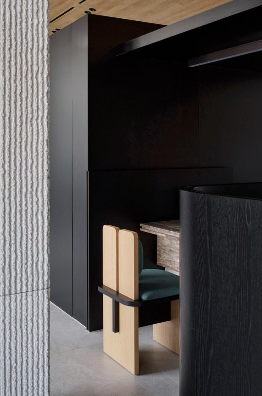 В интерьере используются материалы с тёплой и спокойной фактурой, которые создают ощущение надёжности и стабильности. Цветовая палитра выдержана в нейтральных оттенках, способствующих расслаблению и концентрации.