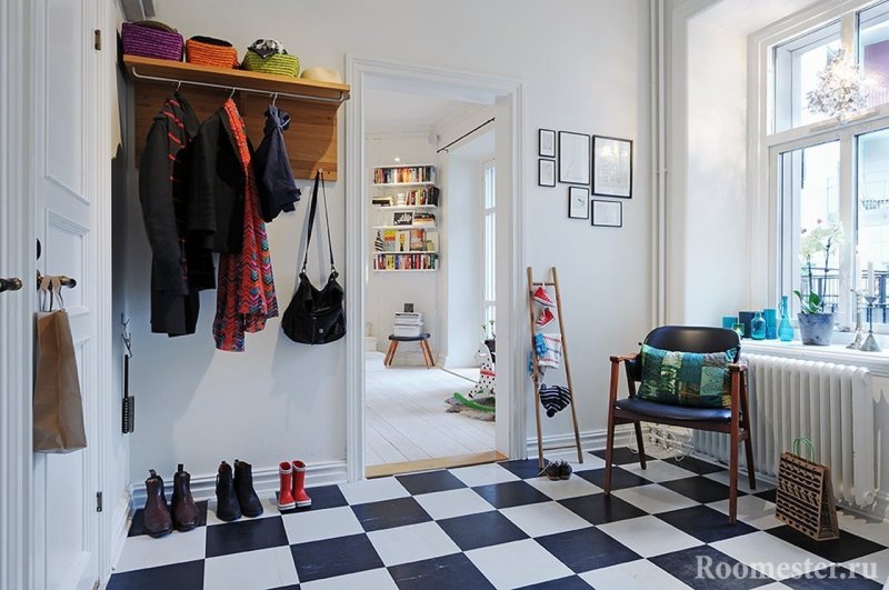 Материалом для покрытия к полу в прихожей обычно выступает плитка или ламинат, чуть реже линолеум. Если останавливать свой выбор на плитке, то лучше приобрести глянцевые изделия, который легче мыть. Однако, он будет скользким в мокрую погоду. Если же ламинат, то понадобится дополнительно звукоизоляция. Хорошо имитирует различные фактуры, однако, не является долговечным как плитка. Слишком много песчинок и абразивных камешков попадает на его поверхность ежедневно.