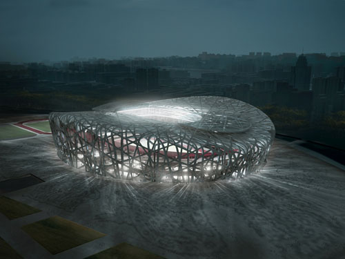 Национальный стадион Пекина, также известный как «птичье гнездо», должен быть построен к олимпийским играм в следующем году. На нем пройдут церемонии открытия и закрытия. Во время Олимпийских игр он будет способен вместить до ста тысяч зрителей. Позже дополнительные места демонтируют, и пространства останется «всего» для восьмидесяти тысяч.