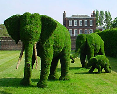 Зеленые скульптуры топиари. Одновременно художественная стрижка растений развивалась и на Востоке. Правда, там она из элемента ландшафтного дизайна превратилась в постулат философии и стала называться «бонсаи». Хозяин не мог принимать гостей в саду, если там не поработал архитектор. Из растений вырезались беседки, коридоры и даже статуи Будды. Но все же это действо отличалось от топиарного искусства других стран.