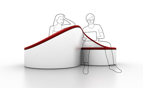 диван от Emmanuel Laffon de Mazieres Несмотря на такую странную форму, сидеть на таком диване – одно удовольствие! Взгляните, у него имеется спинка, на которую можно облокотиться. Оно служит своеобразным разделением между двумя сидящими на нем людьми. Единственное неудобство состоит в том, что на этом симпатичном диване полежать нельзя…
