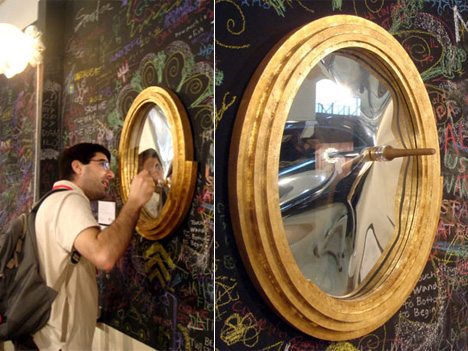 зеркало от William Gurley Будучи ребенком, вы наверняка бывали разнообразных парках развлечений, и уж точно посещали там "комнаты смеха" с кривыми зеркалами. «Лично я, когда был маленьким мальчиком, ужасно их боялся, - говорит один из дизайнеров компании Yanko design. – Ведь ты подходишь к зеркалу и видишь себя, но с чужим лицом и искаженным телом. Я совершенно не понимал, как такое возможно, начинал ощупывать себя, убеждался, что все нормально, но в отражении снова возникало это чудовище. Это не я, это кто-то, сидящий рядом со мной. Но не я! Нет, эти развлечения были определенно не для меня». зеркало от William Gurley А вот если вам нравились подобные шутки, изобретение Уильяма Гёрли (William Gurley) специально для вас. Это типичное «кривое зеркало», однако, им можно управлять с помощью некой волшебной палочки. В зависимости от того, в какую сторону вы ее повернете, ваше отражение будет меняться. А через пару минут и вовсе вернется в нормальное состояние. Неплохо придумано, не правда ли?