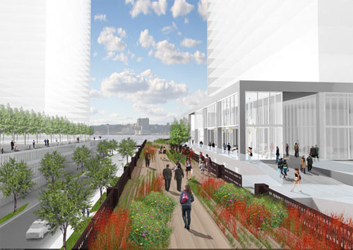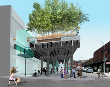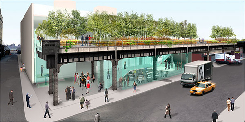 Проект улицы High Line в Нью-Йорке На дороге протяженностью в полторы мили будут посажены сады и организованы места для прогулок, с видами на реку Гудзон и другими известными Манхэттенскими пейзажами. Финальный вариант дизайна все еще в разработке, но последние варианты включают в себя стеклянные балконы, свисающие из-под старой железной дороги, и маленькие клумбы, создающие иллюзию широкого пространства на улицах Манхэттена
