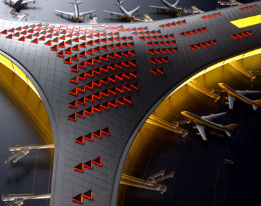 Здание аэропорта в Пекине Чтобы получить представление о его колоссальных размерах, ознакомьтесь с некоторыми числами: более трех километров в длину, 292 пропускных пункта, 179 лифтов, 98 движущихся дорожек и 55 миллионов пассажиров в год к 2020-му году. Также, как и в аэропорте Chek Lap Kok, Фостер решил соединить технологию с превосходным дизайном. Снаружи здание напоминает ящерицу-саламандру. Фигурная крыша обильно покрыта небольшими окошками, а детали интерьера включают в себя традиционные китайские символы и цвета(освещение меняется от красного до желтого по мере вашего продвижения по зданию).
