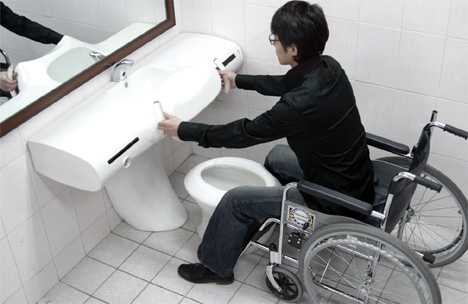 туалет от Changduk Kim & Youngki Hong А у раковины есть специальная спинка, к которой можно прислониться, словом, все для удобства людей с ограниченными возможностями. Также на раковине имеются специальные ручки, которые помогут пересесть с кресла на сидение туалета.