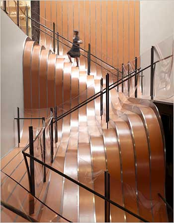 Дизайн – Thomas Heatherwick Житель Лондона, дизайнер Томас Хезеруик (Thomas Heatherwick) создал эту невероятную 55-тонную конструкцию, служащую лестницей, в позапрошлом году. Он работал для нового огромного торгового центра в Нью-Йорке. С тех пор только собирает похвалы со всего света. Они заслуженные: собрать такую лестницу – это натуральный логистический кошмарный сон. Каждая из семнадцати стальных лент должна быть установлена предельно точно, чтобы все кусочки сошлись и вели точно до верхнего этажа. Надо полагать, оно того стоило: благодаря лестнице магазин обрел популярность. А как красиво-то!