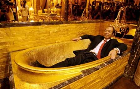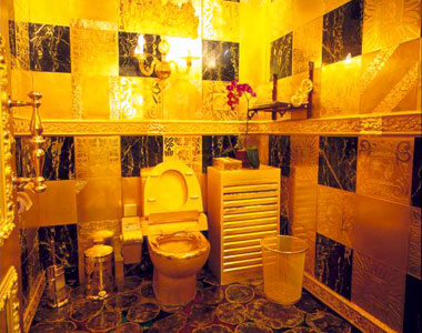 Около трех тонн золота, 50 миллионов долларов и пять лет кропотливой работы трехсот человек. Это статистика самого роскошного туалета в нашем обзоре. Еще более удивительно то, что этот туалет-люкс – выставочная комната для показа ювелирных украшений в Гонконге. Глава компании Hang Fung Лам Сэй-Вин(Lam Sai-wing) и швейцарская часовая компания Swisshorn решили сделать целый дворец площадью в семь тысяч квадратных футов, чтобы похвастаться своим мастерством и поспособствовать развитию туризма в Гонконге. Они назвали его «Золотой дворец Swisshorn», и там действительно все сделано из чистого золота. Стоимость его аренды на одну ночь составит 25 тысяч долларов. Создается впечатление, что создатели запустили внутрь Мидаса и заставили его притронуться ко всему внутри, в том числе и к туалетным принадлежностям. 14-ти каратный унитаз, зеркала из отполированного золота.. в этом туалете сложно будет найти хоть одну несверкающую деталь. Не хотите платить 25 тысяч? Тогда за три доллара можете совершить обзорную экскурсию по особняку. При таких ценах особняк окупит свои вложения всего лишь через 399 лет. Отсчет пошел.