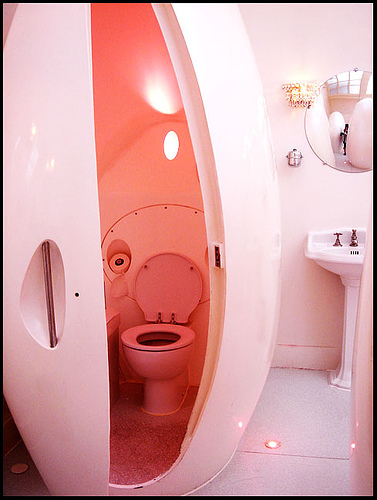 Надеемся, вы не торопитесь. Две стальные цилиндрические кабинки в туалетах, стилизованных под космические корабли, на тридцать шестом этаже бара и ресторана в отеле Pudong Shangri-La, в Шанхае выглядят очень круто, но вам понадобится вечность, чтобы понять, как попасть внутрь. Вот подсказка: двери надо раздвинуть. Внутри, как вы и ожидали, все выполнено в научно-фантастическом стиле с цилиндрическими креплениями и светящимися неоновыми трубками от пола до потолка. Дизайнер Адам Тихани(Adam Tihany)- также спроектировал ресторан Per Se в Манхэттене и отель Aleph в Риме – сказал, что его вдохновила традиционная китайская нефритовая шкатулка для драгоценностей. Но когда вам нужно действительно срочно попасть внутрь, а вы не знаете как, больше на ум приходит китайская пытка каплями воды.
