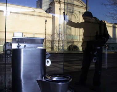 Венецианский дизайнер Моника Бонвичини(Monica Bonvicini) хочет заставить нас поверить, что ее кочующая инсталляция, названная «Не теряй ни секунды» - это комментарий на нежелание поклонников искусства терять драгоценные секунды просмотра выставки. Может быть, но для нас, как и для любого проходящего по улице человека, это выглядит как зеркальная серебряная коробка. Но когда вы внутри, вы можете увидеть, что творится в мире сквозь прозрачное стекло. Мы не удивимся, если все то время, пока вы проведете в этой кабинке, вы будете молиться, чтобы одностороннее зеркало действительно работало. Особо стеснительным придется выбрать более традиционные способы справить нужду, например, в ближайшем ресторане. Работа дебютировала в качестве общественного туалета посреди улицы в Лондоне в 2003-м году, а также в Кунсткамере в Цюрихе прошлым летом. Где туалет будет выставляться в следующий раз, еще не решено. Но если вы увидите гигантскую серебряную коробку в общественном месте, покажите на нее пальцем и громко засмейтесь. Это будет очень жестокая шутка по отношению к тому, кто внутри.