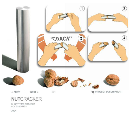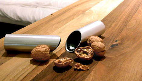 Щипцы для орехов от Christopher Kuh Вероятно, это самые изысканные и симпатичные щипцы для орехов, которые когда-либо были изобретены. Мизерные размеры этого устройства противоречат его поистине «зловещей» функции. Для орехов зловещей, разумеется. Алюминиевая трубка содержит в себе диагональные резцы и отверстия, в которые помещается орех. Вы просто кладете его туда и поворачиваете две половинки в нужную сторону, после чего как бы скручиваете. Вуаля, орех расколот! Просто, безболезненно и, главное, никаких порезов и отбитых пальцев. Да и орех не разлетается на много маленьких кусочков, а остается цельным, если правильно пользоваться щипцами.