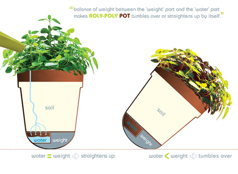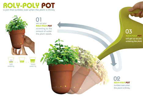 горшки от Samgmin Bae Как и люди, цветки начинают падать все ниже и ниже, причем в прямом смысле, когда им не хватает влаги. Они не могут жить без воды, как все живое на нашей планете, но в отличие от людей, у растений нет возможности общаться и сообщить человеку, что их нужно полить. Естественно, мы стараемся следить за ними, но повседневная жизнь полна хлопотами и заботами, и не всегда мы помним о любимых кактусах, фиалках, фикусах и прочих растениях, которые каждый из нас держит дома. Что же делать? На помощь придет Roly-Poly Pot (Маленький пухлый горшочек)! горшки от Samgmin Bae Он использует воду как противовес, медленно опрокидывая горшок вниз, как только подставка пустеет. Но не это самое главное и интересное, а то, что система этих горшков будет работать с любым растением и его потребностями. Как только вы видите, что горшок с вашим любимым растением накренился, может смело идти наполнять лейку и поливать его. Оно само вам это сообщило! Пока идея находится лишь в разработке, но наверняка скоро появится на рынке массовых продаж. горшки от Samgmin Bae Дизайнер: Самгмин Бэ (Samgmin Bae)