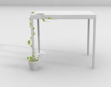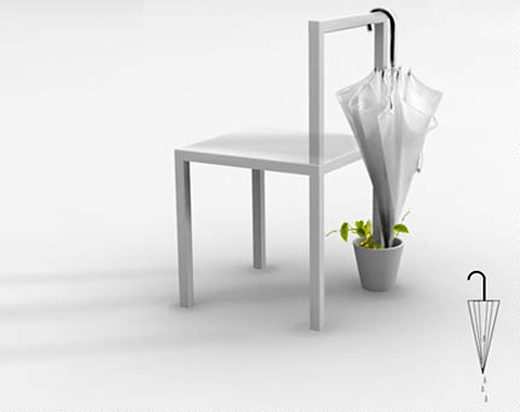 стул от Zhuo Wang Ну, а идея с поливкой и вовсе выглядит очень интересной. Если вы пришли с прогулки, и гуляли под дождем, то лишь повесьте мокрый зонтик на спинку стула. Капельки будут стекать прямо в горшок. Это и экономия воды, и просто отличная идея! Также в коллекцию входит и стол похожей идеи.