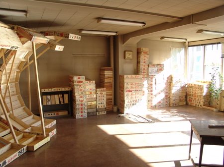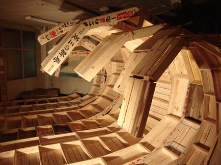 Инсталляция из ящиков из-под рыбы Посетители подавлены угрожающе нависшими над ними волнами из рыбных коробок, которые дизайнер взяла с рыбного рынка города Sapporo.
