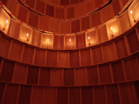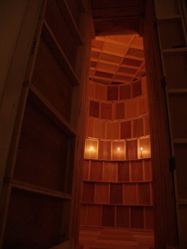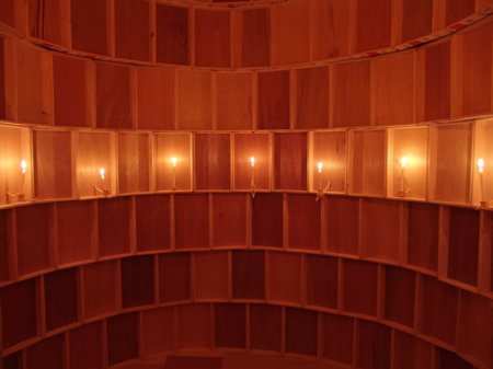Инсталляция из ящиков из-под рыбы Он представляет собой небольшой зал из линий пустых коробок с горящими свечами в них. Напоминает жуткий, кошмарный иконостас заброшенной церкви в страшном сне или фильме ужасов, из которого сатанисты вынесли и уничтожили все иконы.