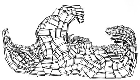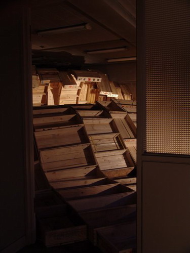 Инсталляция из ящиков из-под рыбы Вдруг они осознают, что невольно дрейфуют в сторону мрачного центра этой композиции.