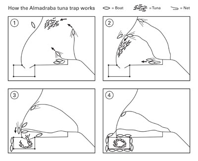 Инсталляция из ящиков из-под рыбы Выставка построена по образу Almadraba, метода ловли тунца, распространенной в средиземноморье. Эта ловушка – определенная причина уменьшения популяции тунца. Вдохновителем стал рыбный рынок Tsukiji в Токио.