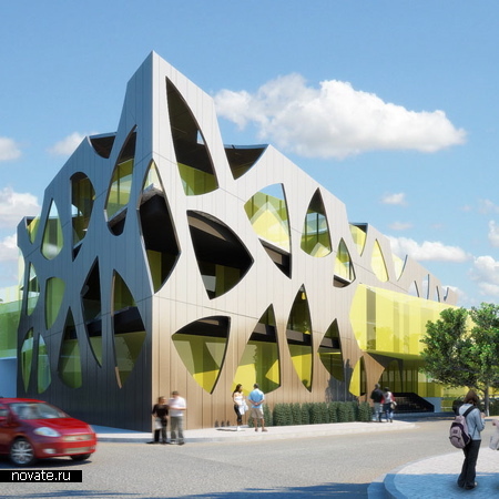 Проект торгового центра от Pascal Arquitectos Цель была достигнута с помощью необычного дизайна фасада здания, который состоит из двух частей – цинковой пластиной с большими нестандартными отверстиями и слоистого стеклянного каркаса неравномерного желтого цвета.