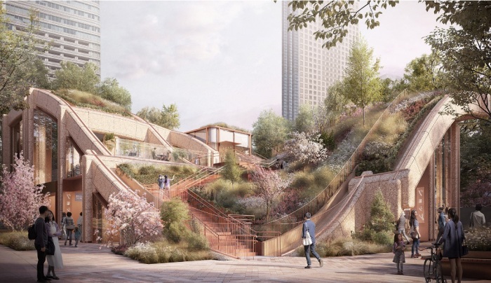Крыша перголы подчеркивает природный рельеф долины, в которой расположен район Minato (визуализация Toranomon-Azabudai). | Фото: hpland.ru.