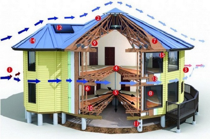 Используя в строительстве круглые формы, которые, как известно, более надежны при порывах сильного ветра, ведь поток воздуха не оказывает давление на одну сторону здания, он просто скользит, не причиняя вреда строению. Равно как и скатные крыши, которые спроектированы так, чтобы свести к минимуму влияние его давления.