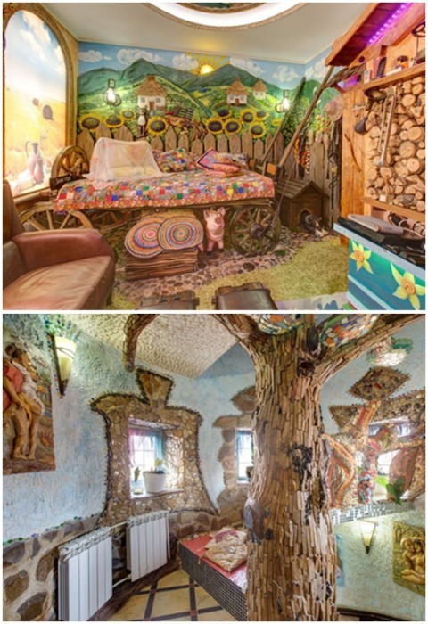 Деревенская резиденция «Сеновал» удивит кроватью-телегой с охапкой душистого сена из Алтая и одеялом их ярких разноцветных лоскутов. Не говоря об умилительном панно, где можно увидеть живописные мотивы или холодильнике, который сделан в виде улья.
