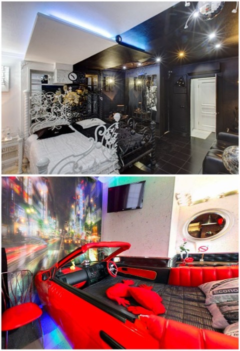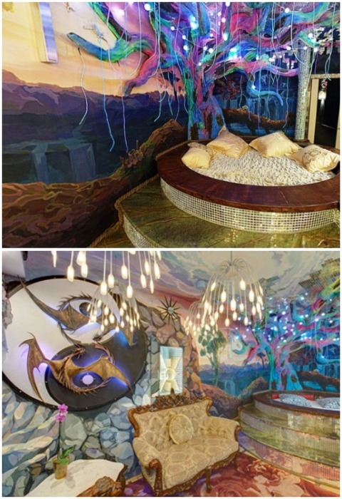 Так, например, апартаменты «Небеса» напоминают небесный пейзаж с огромной кроватью, в виде облака раскачивающегося на цепях и интерьером способным перенести на седьмое небо.