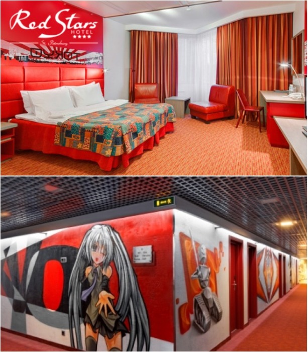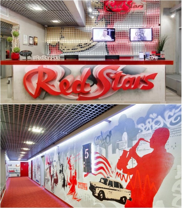 В 2011 году в Санкт-Петербурге открылся необычный отель Red Stars, стены которого украшают кричащие граффити. Каждый этаж расписан в стиле культурных традиций разных стран: Японии, Америки, Бразилии, Англии. Так, например, на этаже США красуются небоскребы Нью-Йорка и статуя Свободы, Япония узнаваема благодаря героям аниме, Англию можно узнать по лондонским улочкам и портрету Шерлока Холмса, а Бразилия выделяется яркими красками танцевального карнавала.
