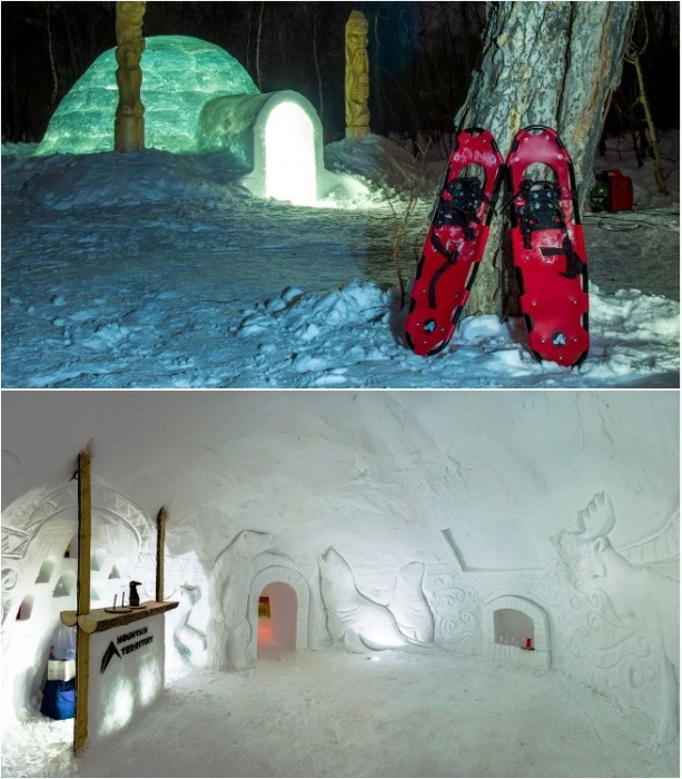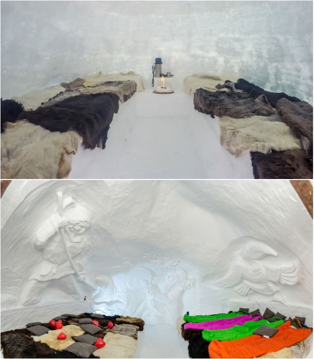 Изнутри иглу украшены барельефами с дикими северными животными и охотниками (Иглу-отель «Горная территория», Камчатка). | Фото: mir-vpechatleniy.ru