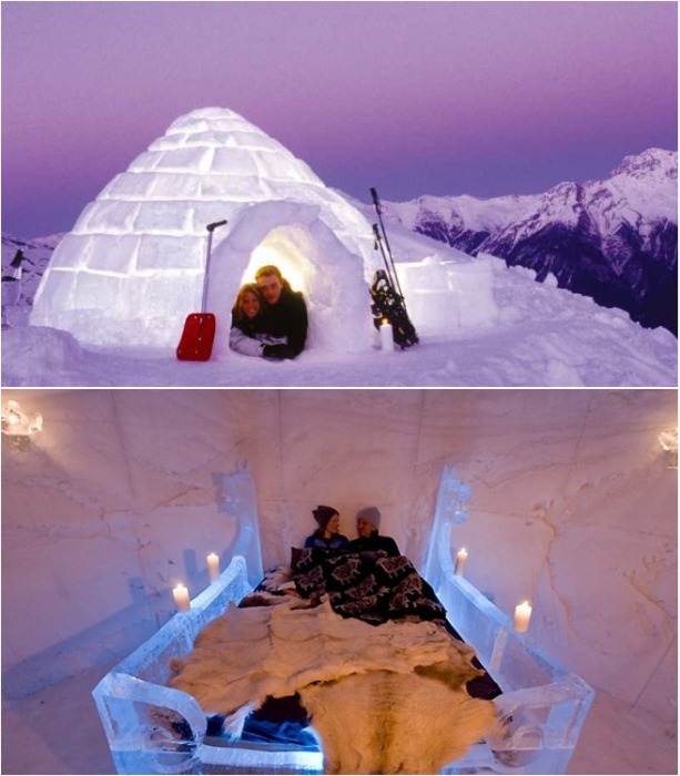 Для молодоженов есть двухместные номера с ледяной царской кроватью (Иглу-отель «Горная территория», Камчатка). | Фото: mir-vpechatleniy.ru.