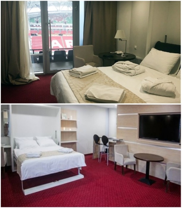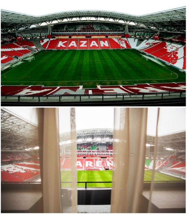 Для почитателей футбола прямо на восточной трибуне стадиона «Казань-Арена» был создан удивительный отель Stadium Hotel. Теперь фанаты смогут отдохнуть в непосредственной близости к футбольному полю. Естественно, во время матчей эти скайбоксы превращаются в VIP-ложи, но в остальное время посетители смогут пожить в самом прямом смысле на трибуне, причем в довольно комфортабельных условиях.