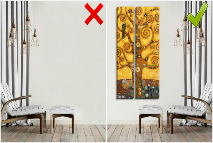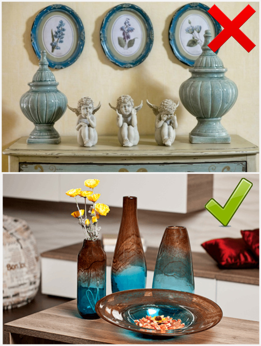 Элементы, не подходящие по стилю. | Фото: AllStick.ru. Будьте осторожны с попытками внести в интерьер свежесть с помощью ярких броских деталей. Их нужно выбирать, отталкиваясь от общего стиля интерьера. Иногда, одна неудачная слишком яркая, дешевая или аляповатая картина может испортить все. Если не уверены в том, как тот или иной элемент впишется в структуру помещения, лучше вовсе отказаться от его использования.
