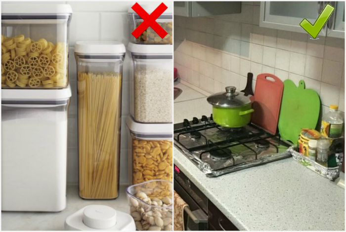 Пластиковые бутылки с жидкостями. | Фото: uborka.co, Бесплатка. По возможности минимизируйте количество пластиковых бутылок и целлофановых упаковок на своей кухне. Речь идет о бутылках с маслом, моющим для посуды, упаковках с макаронами и крупами. Такие упаковки выглядят неряшливо и создают на кухне ощущение беспорядка. По возможности замените их на покупные контейнеры и диспенсеры из стекла или плотного пластика.