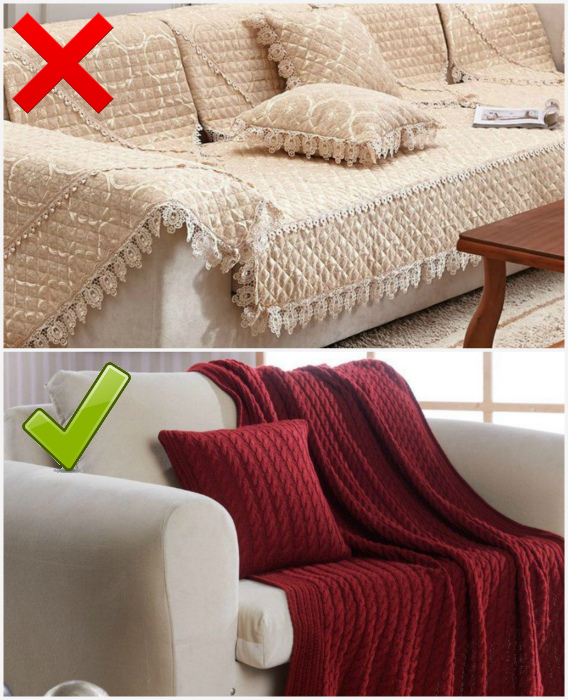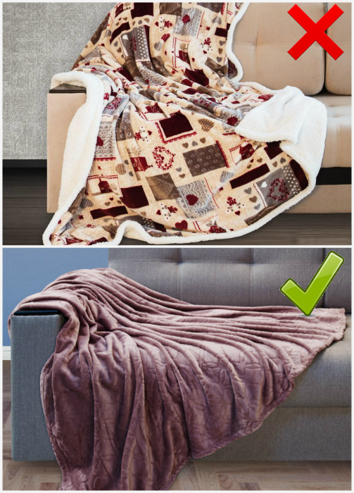 Пледы на мебели. | Фото: Pinterest, DekorMyHome. Привычка покрывать мебель пледами - еще один старый прием, который вышел из моды много лет назад. Раньше в этом был смысл, ведь обивка мебели плохо переносила чистку, но новые современные материалы могут отталкивать влагу и легко поддаются очищению. Если и хотите использовать плед, выбирайте тонкий, легкий и пушистый и не накрывайте им мебель полностью, просто накидывайте с одной стороны.