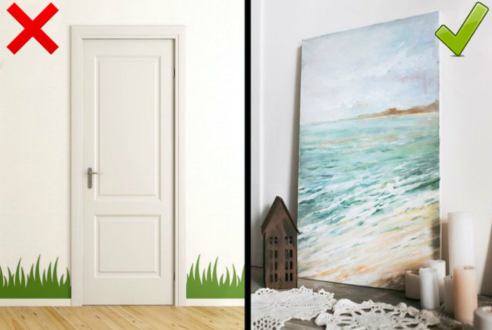 Дешевые виниловые наклейки. | Фото: Bomba.co. Да, с помощью виниловых наклеек можно решить некоторые проблемы, вроде дефектов на обоях и торчащих проводов, однако такой декор в некоторых пространствах просто неуместен. Наклейки привлекают внимание, но выглядят дешево и по-детски. Поэтому, если вам необходимо что-то скрыть, перемещайте мебель или используйте хорошие картины.