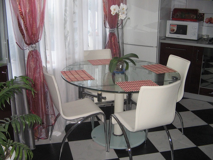 Что касается плюсов, то их гораздо больше. Круглый стол занимает намного меньше места, чем квадратный или прямоугольный, особенно, если поставить его вплотную к окну. Во время трапезы вам не будут мешать его ножки, поэтому сидеть будет максимально удобно. За таким предметом интерьера можно разместить много людей, все зависит от выбранного размера. К тому же, он создает уютную, романтическую атмосферу и отлично вписывается в любой интерьер.