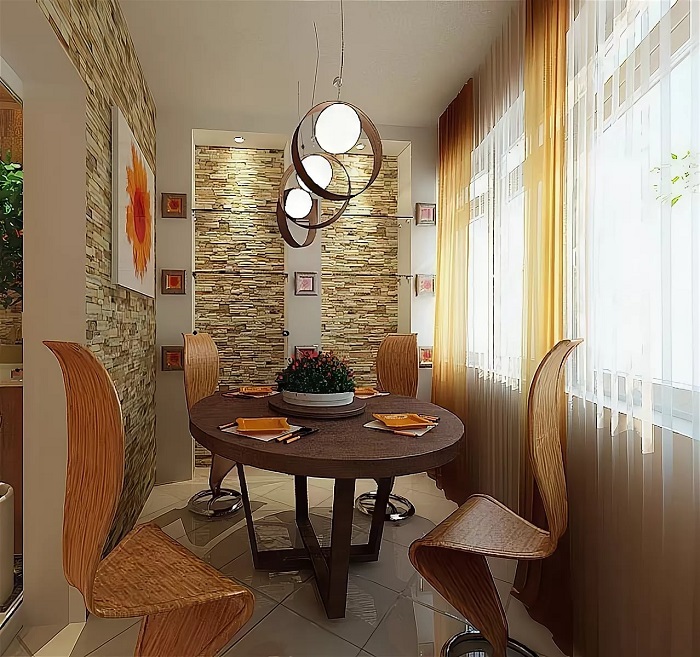 Если из вашей кухни имеется выход на балкон или лоджию, то вам повезло – вы вполне можете организовать столовую там. Хорошо, если они изначально будут утеплены и застеклены. Если же нет, то придется над этим поработать и только после завершения ремонта переносить туда обеденную группу.
