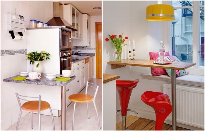 Крохотная кухня – серьезная проблема для владельцев квартир, особенно, если в ней проживают несколько человек. Однако при правильном подходе вы сможете разместить в маленьком помещении не только кухонный гарнитур, бытовую технику, но и небольшую столовую. Рассказываем, как именно это сделать. Если площадь вашей кухни составляет меньше 8 квадратных метров, то вы не понаслышке знаете, как тяжело ее обустроить. Вполне возможно, что вам пришлось купить компактный холодильник, маленькую раковину и отказаться от функциональных навесных шкафов в пользу открытых полок лишь для того, чтобы разместить на кухне все самое необходимое. Но ведь есть еще и столовая, которая также должна где-то находиться. Novate.ru предлагает вам ознакомиться с несколькими вариантами, которые помогут спасти положение. Идея 1: Столовая на лоджии/балконе Столовая на балконе станет уютным местом для трапезы. / Фото: handspc.ru Если из вашей кухни имеется выход на балкон или лоджию, то вам повезло – вы вполне можете организовать столовую там. Хорошо, если они изначально будут утеплены и застеклены. Если же нет, то придется над этим поработать и только после завершения ремонта переносить туда обеденную группу. Столовая на балконе или лоджии смотрится очень красиво и имеет массу преимуществ. Во-первых, вы сможете трапезничать и наслаждаться прекрасным видом (если, конечно, балкон выходит не во двор). Во-вторых, там будет по-настоящему уютно, особенно, когда вы постелите теплый пол, чтобы и зимой в этой комнате было комфортно находиться. А, в-третьих, вы сможете сэкономить ценные квадратные метры непосредственно в самой квартире, что тоже немаловажно. vplate.ru Совет: Если размеры балкона позволяют, кухню можно полностью перенести туда. Там можно разместить весь гарнитур, столешницу, электрические приборы и так далее. Идея 2: Стол-трансформер Стол-трансформер компактный и занимает минимум места. / Фото: betterhomestitle.com Этот вариант, к сожалению, будет актуальным лишь в том случае, если в квартире живет не более трех человек, так как стол-трансформер отличается небольшими габаритами. Однако для небольшой семьи он идеально подойдет. Стол не занимает много места, при необходимости его возможно разложить, чтобы посидеть, например, с друзьями, а потом вернуть в исходное положение. Покупка подобного предмета интерьера позволить сэкономить пространство и дать себе место для маневров. Есть у стола-трансформера и еще несколько преимуществ, среди которых: разнообразие моделей (можно с легкостью подобрать необходимые размеры, цвет, материал, форму), легкость в эксплуатации, надежность механизмов, которые позволят эксплуатировать мебель на протяжении многих лет, возможность менять высоту (функция предусмотрена не во всех моделях). Идея 3: Барная стойка Барная стойка - отличное решение, если в доме проживают 1-3 человека Барная стойка также является неплохим вариантом для людей, которые страдают от нехватки места на кухне. Она компактная и при желании может использоваться не только в качестве обеденной зоны, но и в качестве столешницы. Также при желании можно расширить функциональность данного предмета интерьера – расположить в углу мелкую бытовую технику, сверху добавить навесные шкафчики. Кроме того, в комплекте с барной стойкой иногда идут ящики, полки, рейлинги и ряд других полезных констр
